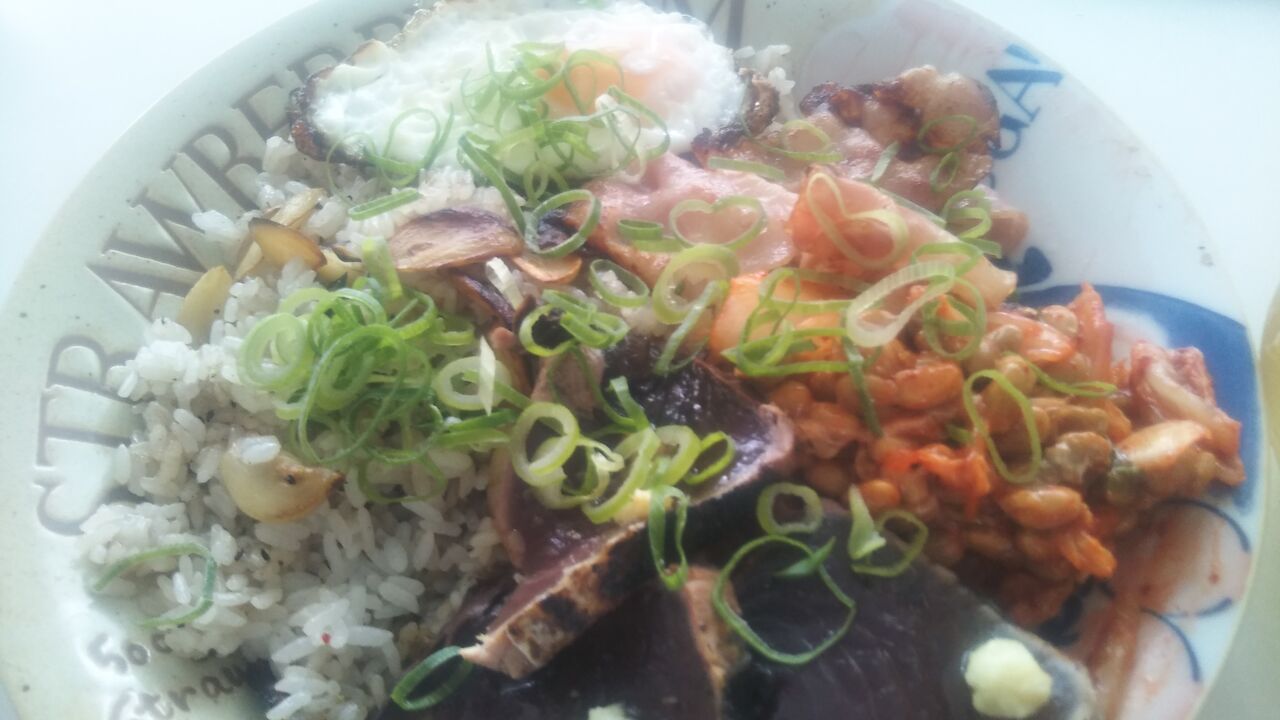 ごはん、玉子、ベーコン、かつおたたき、納豆、キムチ、にんにく、ねぎ