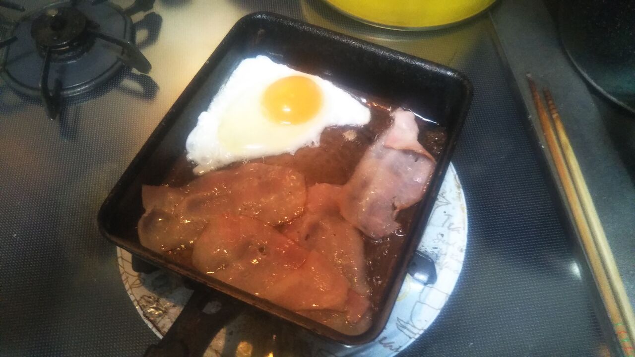 目ん玉焼き、ベーコン、弱火で、じっくり焼いてくださいませ!