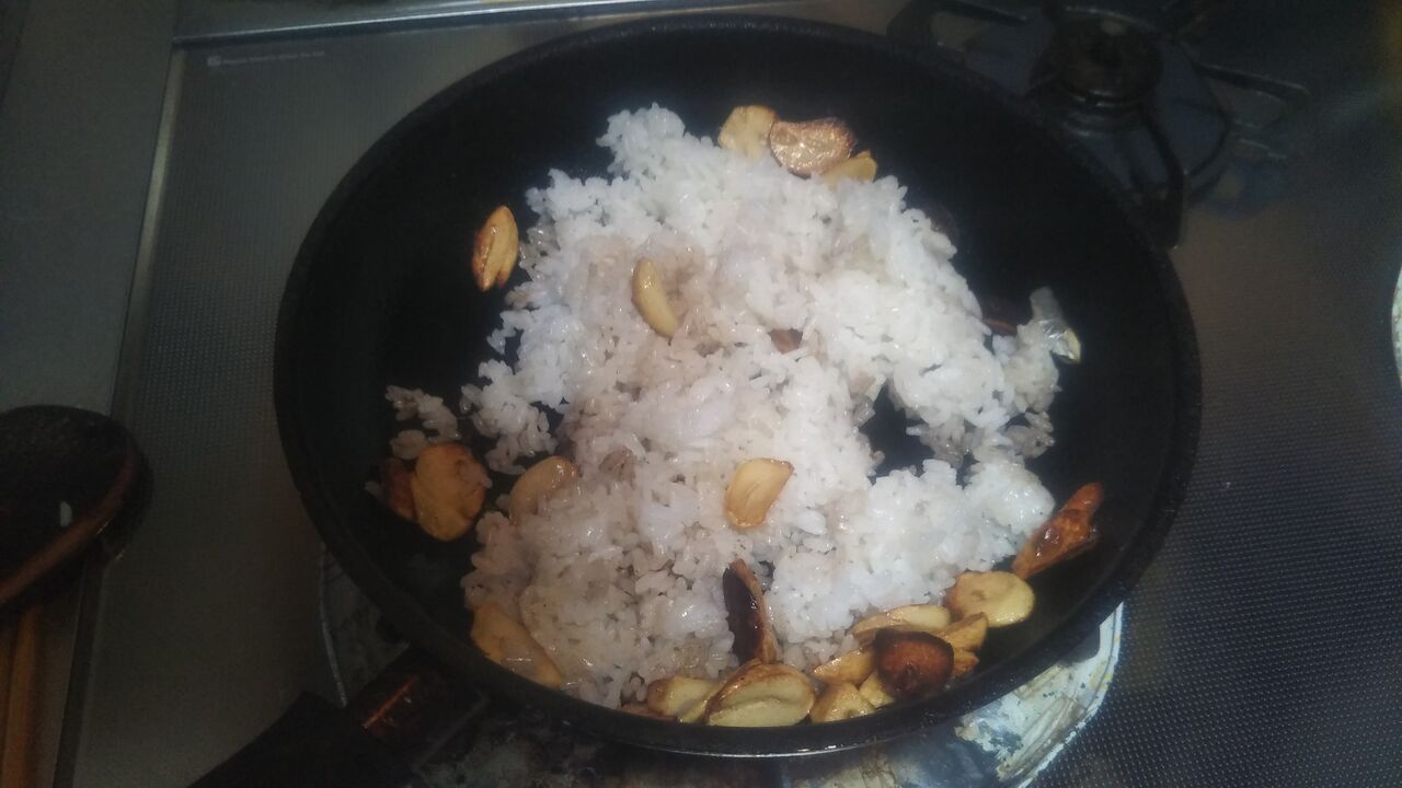 にんにくがこんがりしたら、ごはんを投入です。塩、ブラックペッパー、味の素をふりふりして、あとはひたすら、まぜまぜまぜりんこでございます。十分に混ざったら、関税、基、完成です!