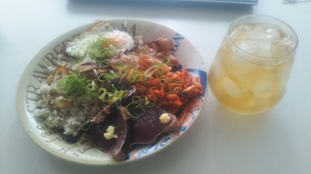 やっぱ、アレですよねぇ、上級国民食に、目ん玉焼きとベーコンは、欠かせません、mustですよねぇ。これらだけでも、十分ですが、今回のように、納豆キムチとかつおたたきが加わると、上級国民感が、マシマシになります。